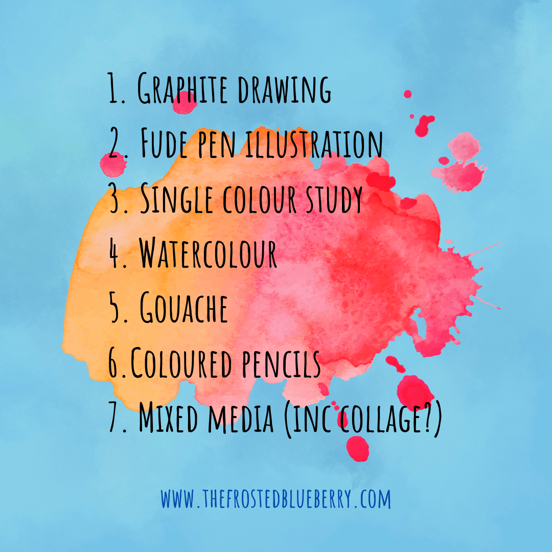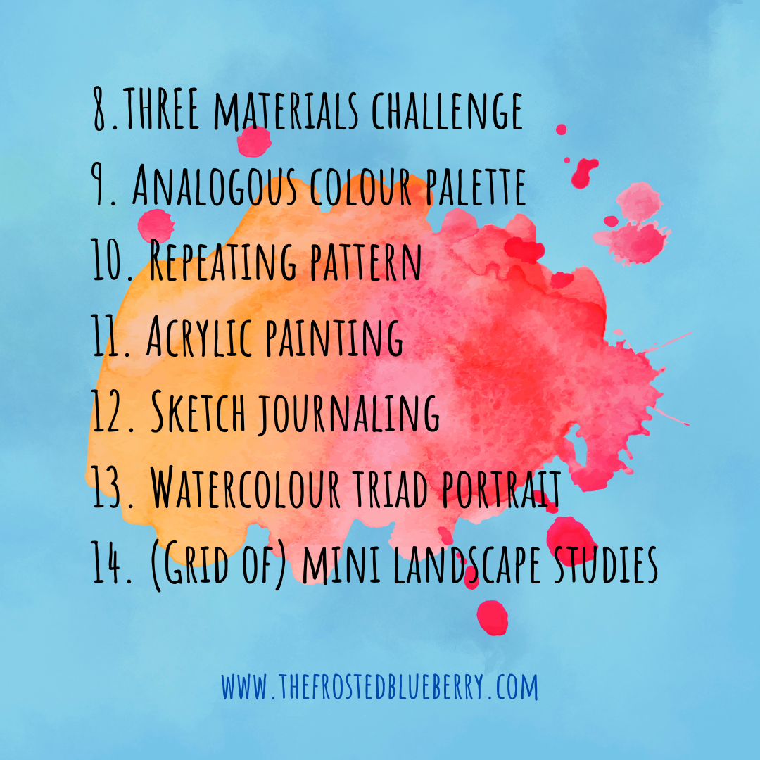 I designed my own list of 14 prompts with the sole purpose to invite creativity into my life on a daily basis and encourage me to explore and experiment. I didn’t want a list of nouns or adjectives which automatically constrain my thoughts, instead opting or 14 prompts centred on types of media or art techniques.