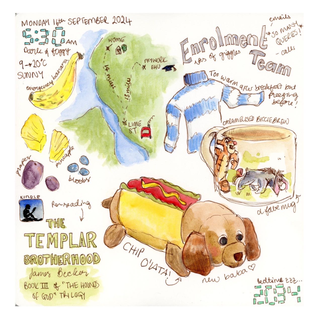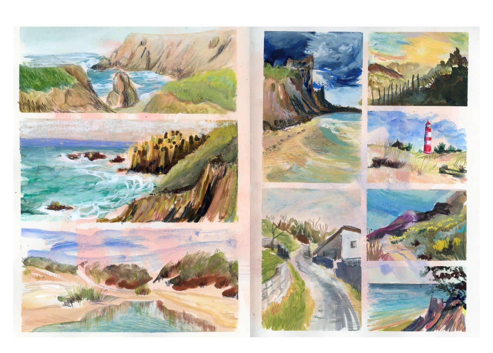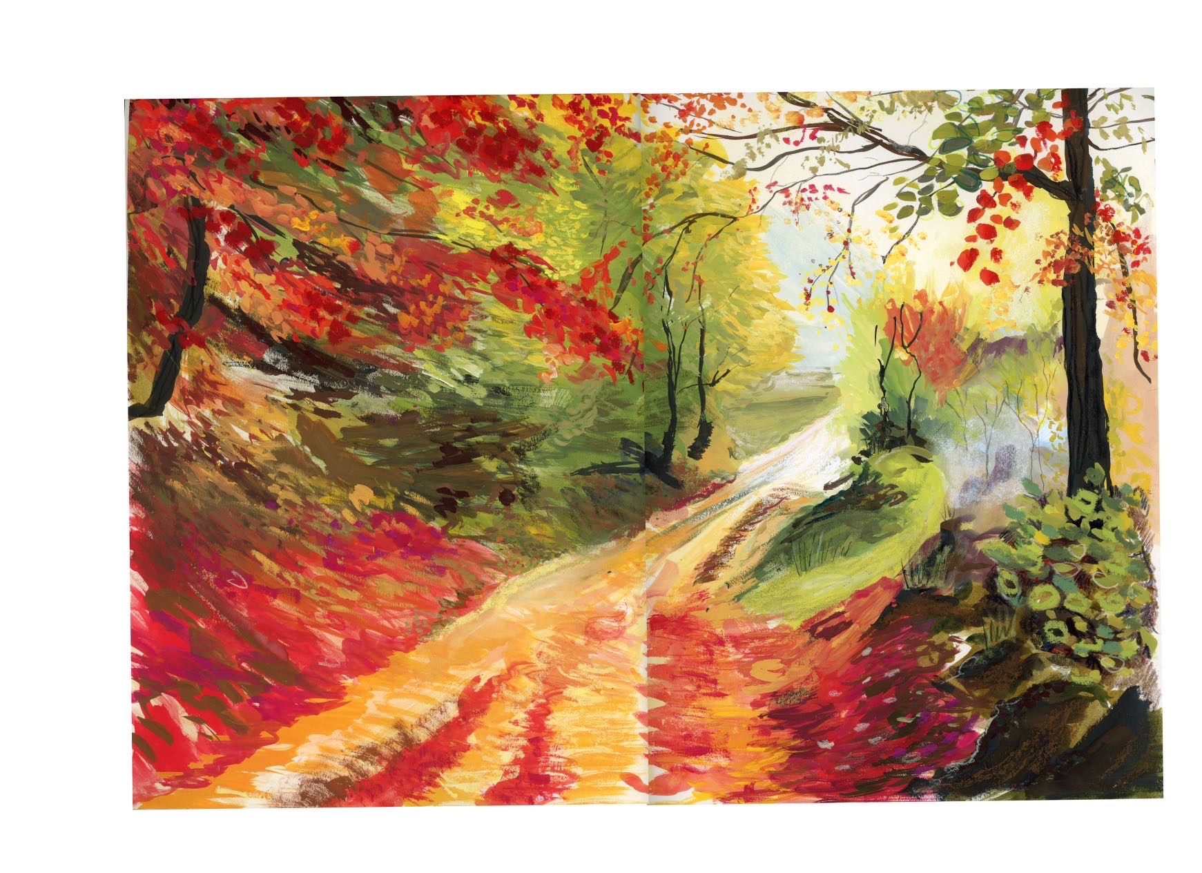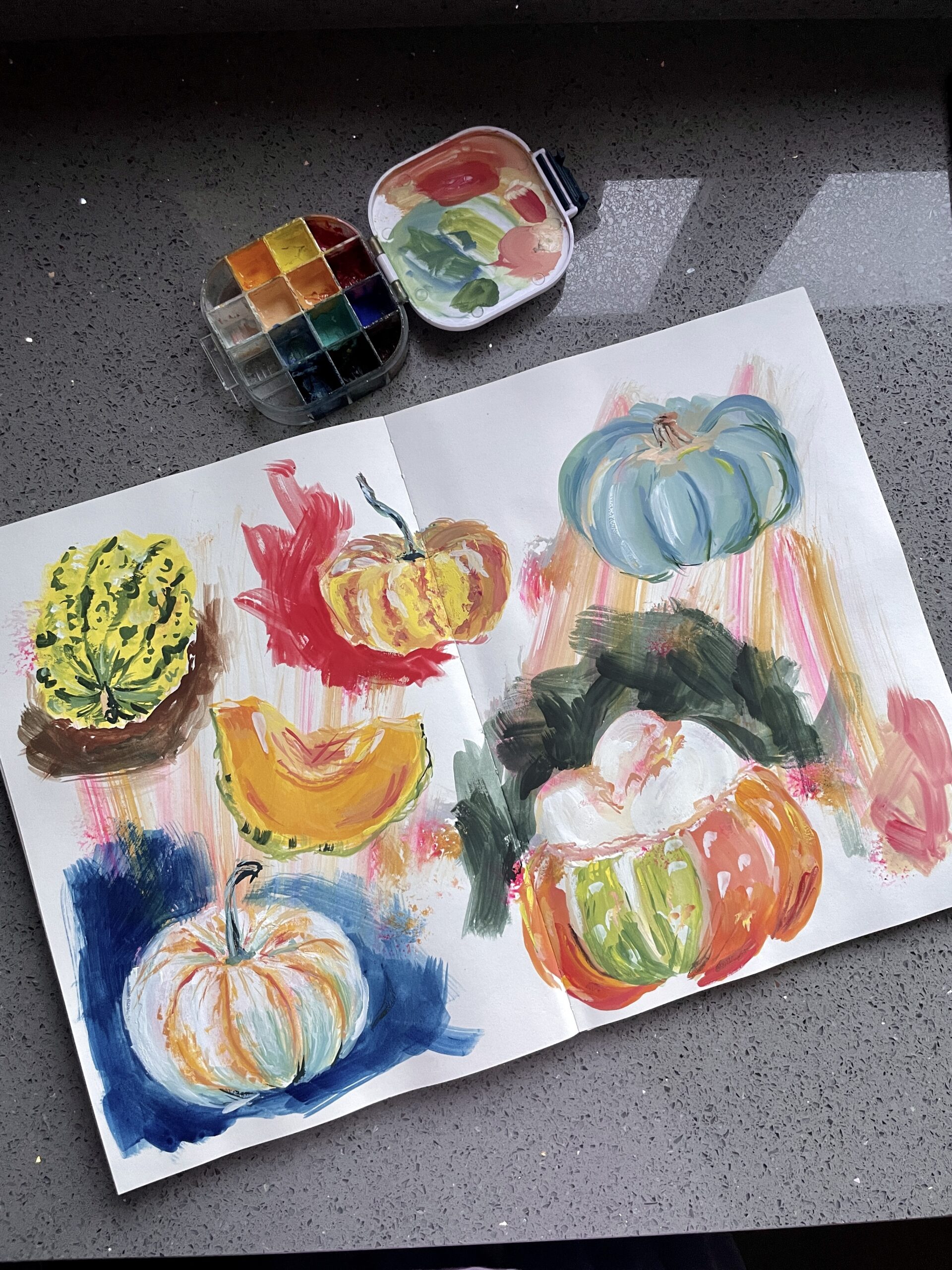 I didn’t really connect with the three material prompt and was unsatisfied with my basic sketch in marker, acrylic paint and graphite. Perhaps that is something I will explore again at a later date to see where it takes me but otherwise, I was very happy to see this collection coming together. I love the pumpkins very much, the mixed media forest lets me see how much progress I’ve made in the 4 years since I first tried to paint it, and the landscapes really confirmed that true happiness in art making is in being creative not slavish copying of a reference.