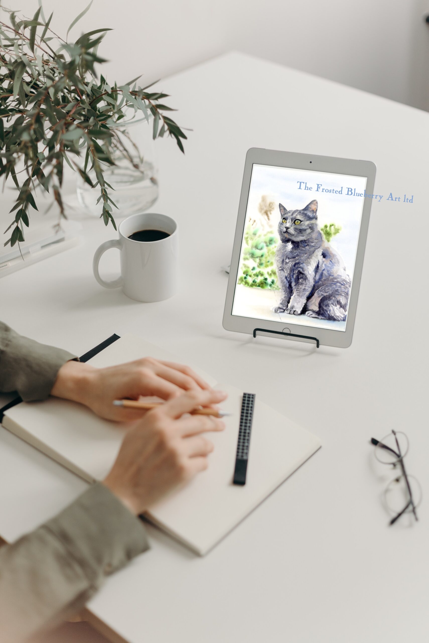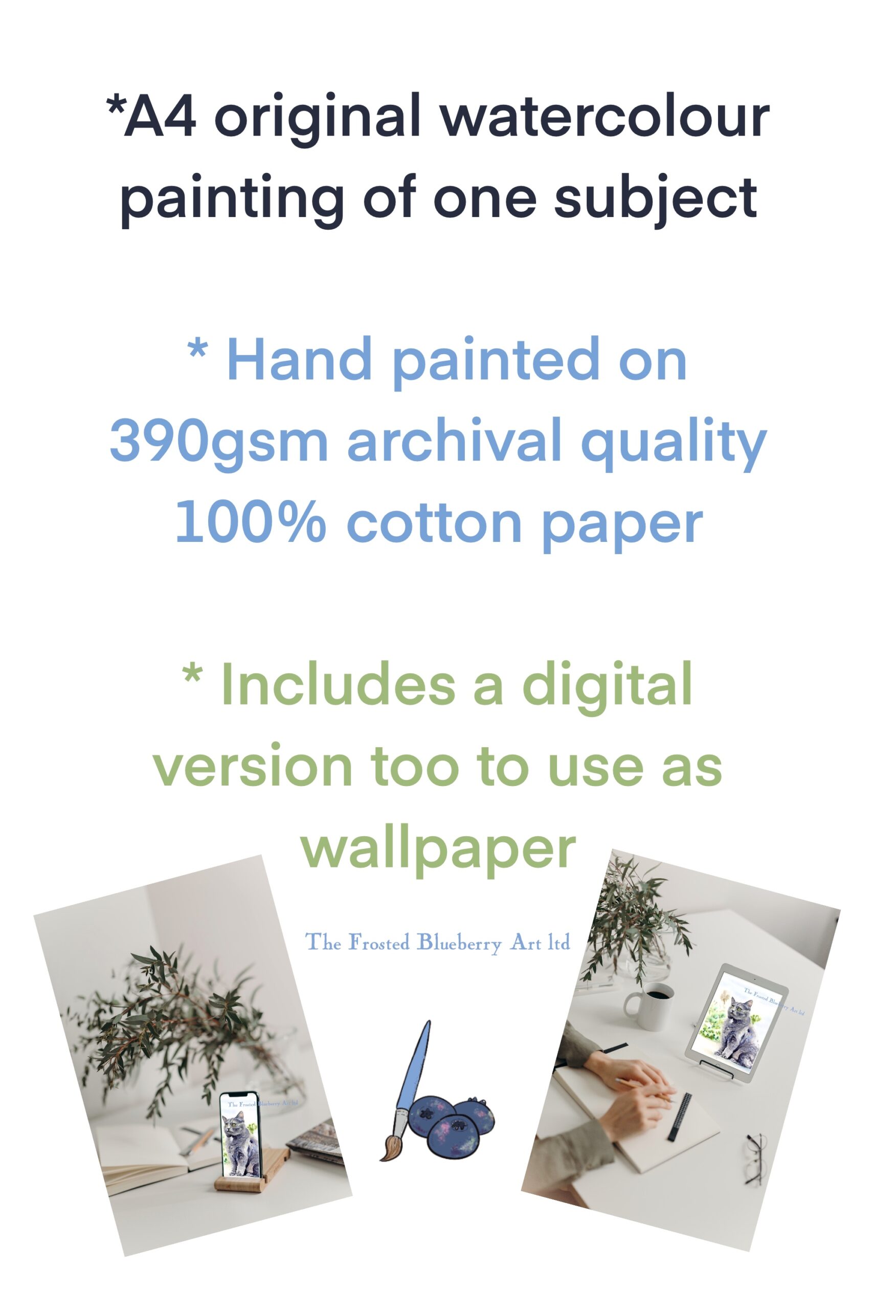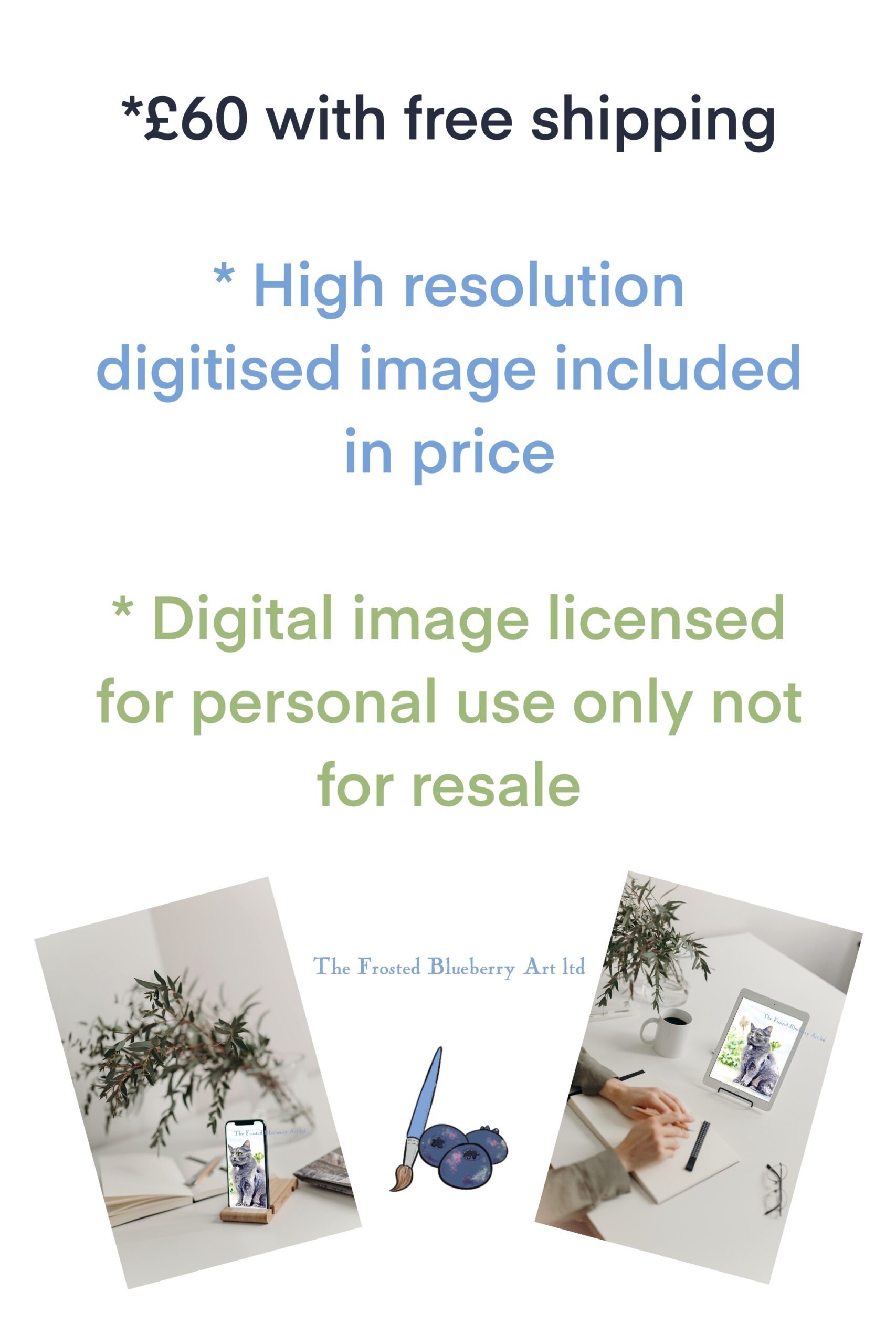 The digital file will be sent to you on completion of the portrait so you can enjoy posting that on social media (don’t forget to tag me on Instagram @thefrostedblueberry) or using on your phone so your beloved pet is always by your side. It will be a high resolution file size which allows you to print it out onto items like mugs or mouse mats too if you want some more bespoke merch showing off your pet!